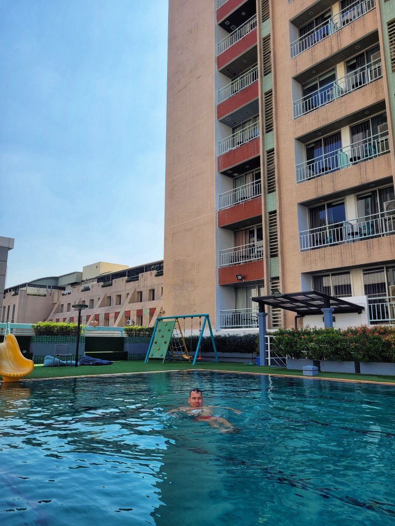 Dann 8 h 40 nach Bangkok. Nicht der schönste Flug. Turbulenzen und eng. Morgens um 9 landeten wir in Bangkok. Wir hatten ein Shuttle ans Hotel. Und nach 55 Minuten Fahrt im Linksverkehr waren wir dann am Hotel. Packten die Badesachen und begaben uns zum Pool…