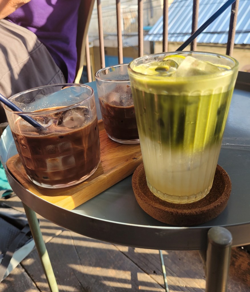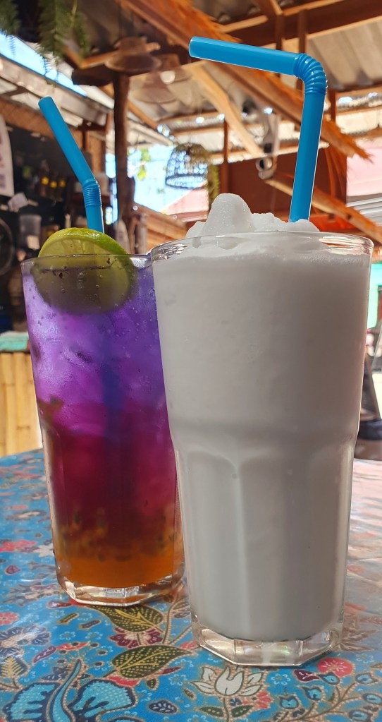 Coconutshake und ein Butterfly Pea-Tee mit Maracuja