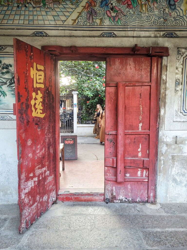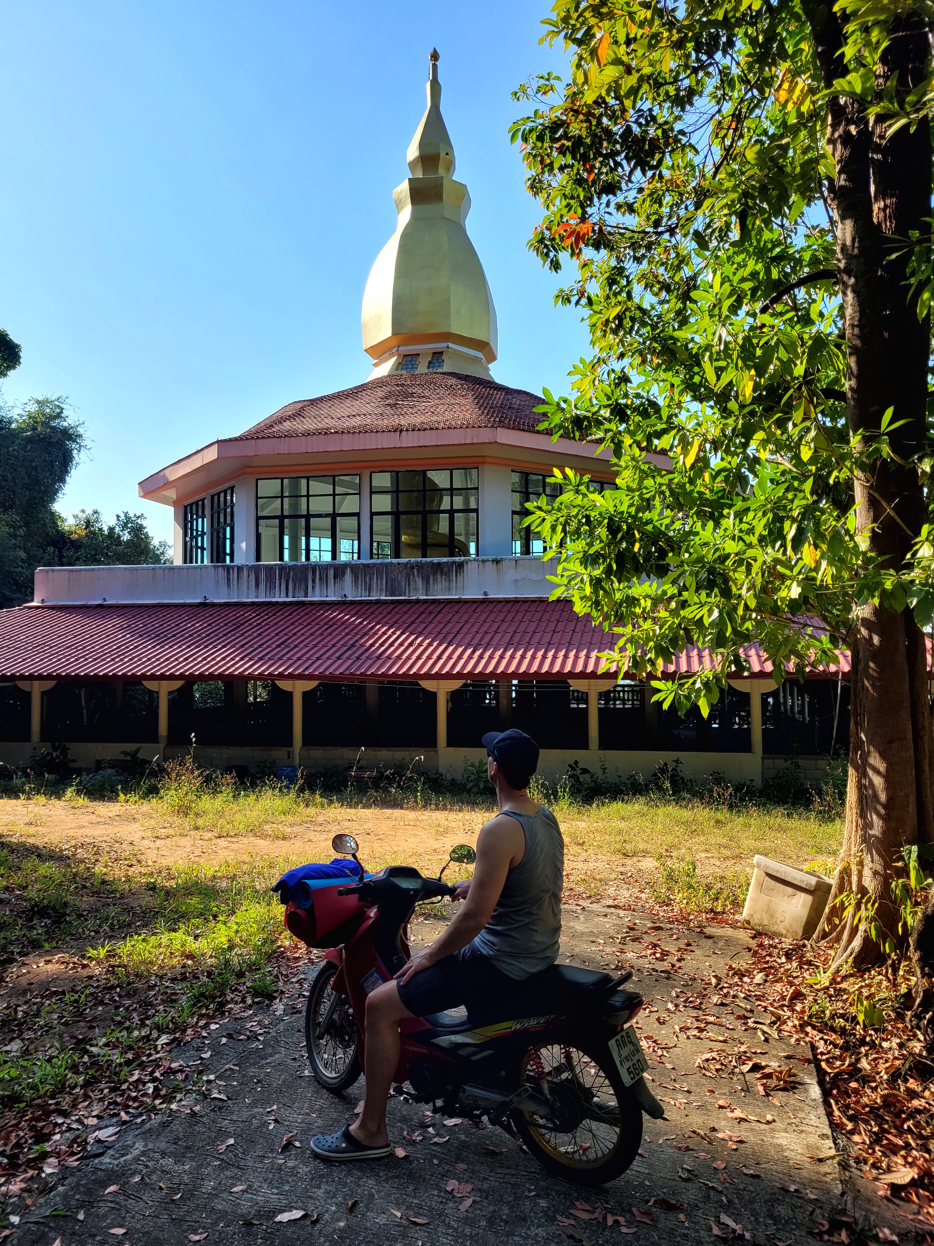 Wir kamen auf unseren Roller, hier auf dem Festland mit Helm, an einem Tempel vorbei…