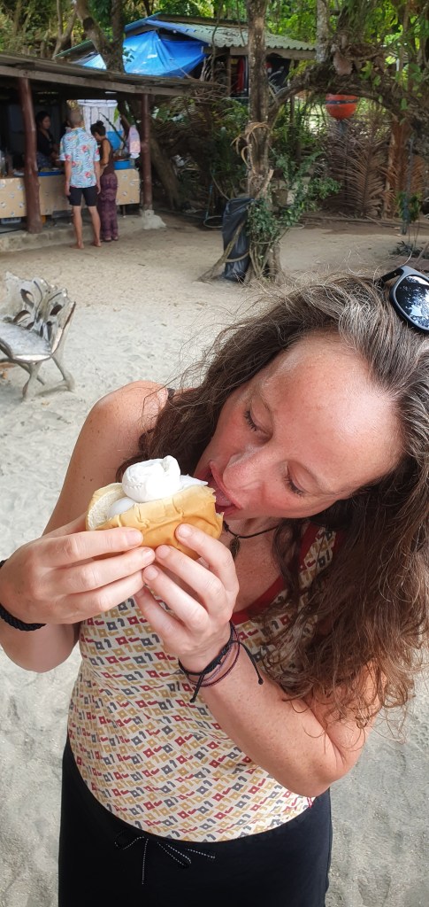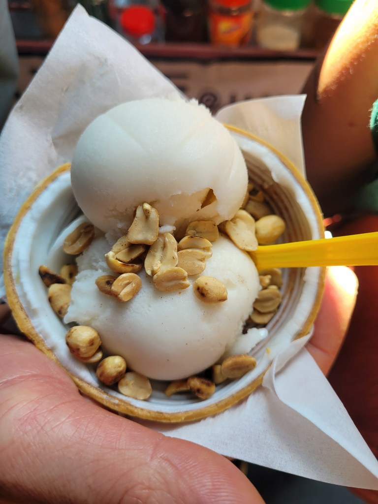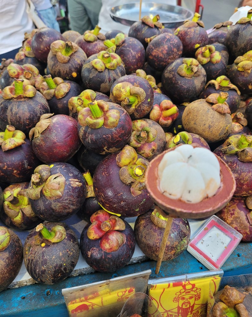 Wir haben uns aber durch die anderen Straßenstände gefuttert : Fischkuchen, Mangosteen und Drachenfrucht in 2 verschiedenen Farben, Kokos- Schoko-Pfannkuchen, Wachteleier, Reismehl-„Tacos“ mit süßer Füllung 🥰 alles Dinge, die ich so zuvor noch nie gesehen, geschweige denn gegessen habe!
