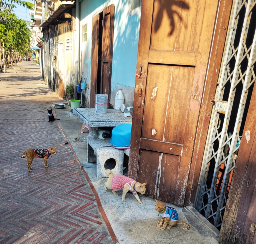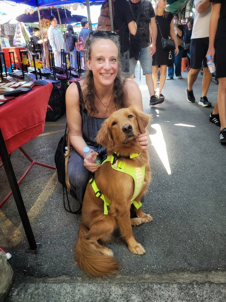 Wir trafen uns mit Dominik und seiner Hündin Sandy. Und schlenderte los. Allerdings kamen wir nicht weit, denn Thailänder lieben Hunde und verehren Suchhunde. Und Sandy ist so ein Suchhund. Viele wollten streicheln, ein Bild schießen…