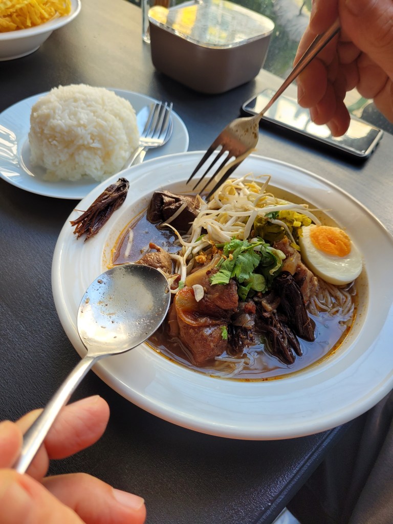 Guay Jub – gerollte Reisnudeln in einer kräftigen, pfeffrigen Suppe mit Schweinefleisch, Innereien, Ei und Knoblauch.