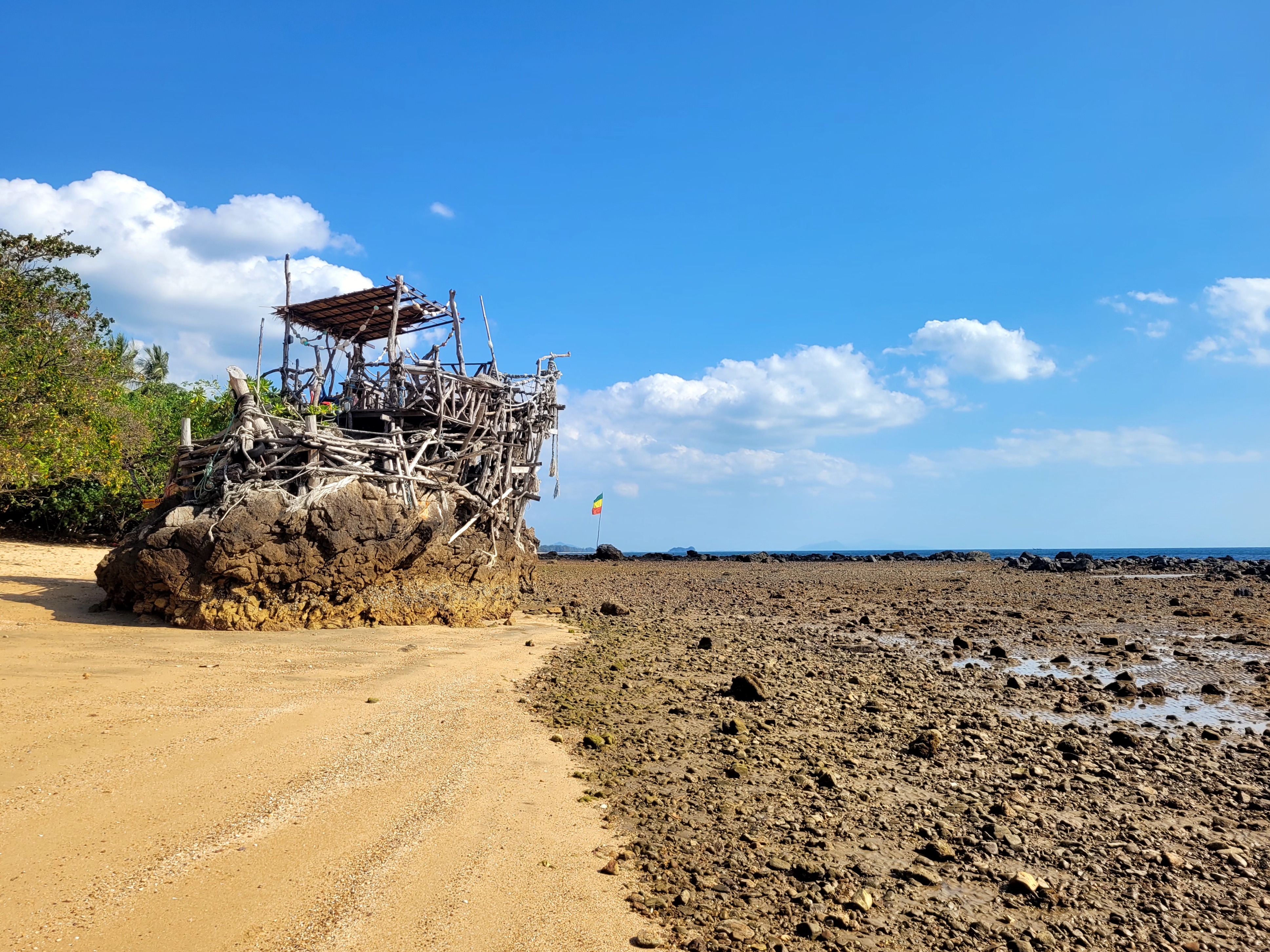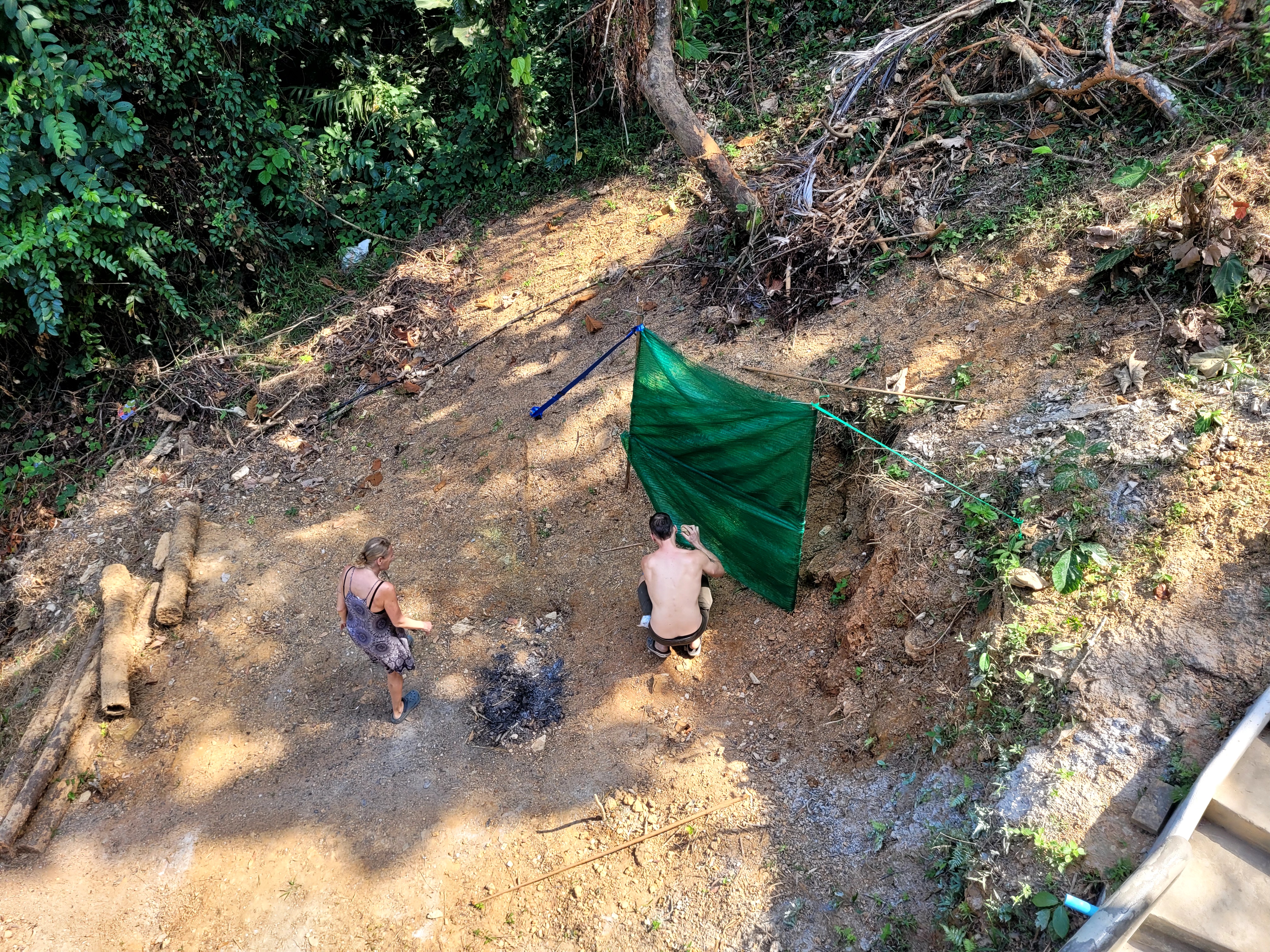 Am nächsten Tag war Strandtag angesagt. Wir hatten ein gebrauchtes, großes Tuch gefunden und uns am Strand immer ein Dach damit gebaut. Denn in der Sonne hielten, zumindest wir, es nicht den ganzen Tag aus. Und so gingen die Stunden mit baden, Buch lesen, zwischendurch mal was Essen auch vorbei…