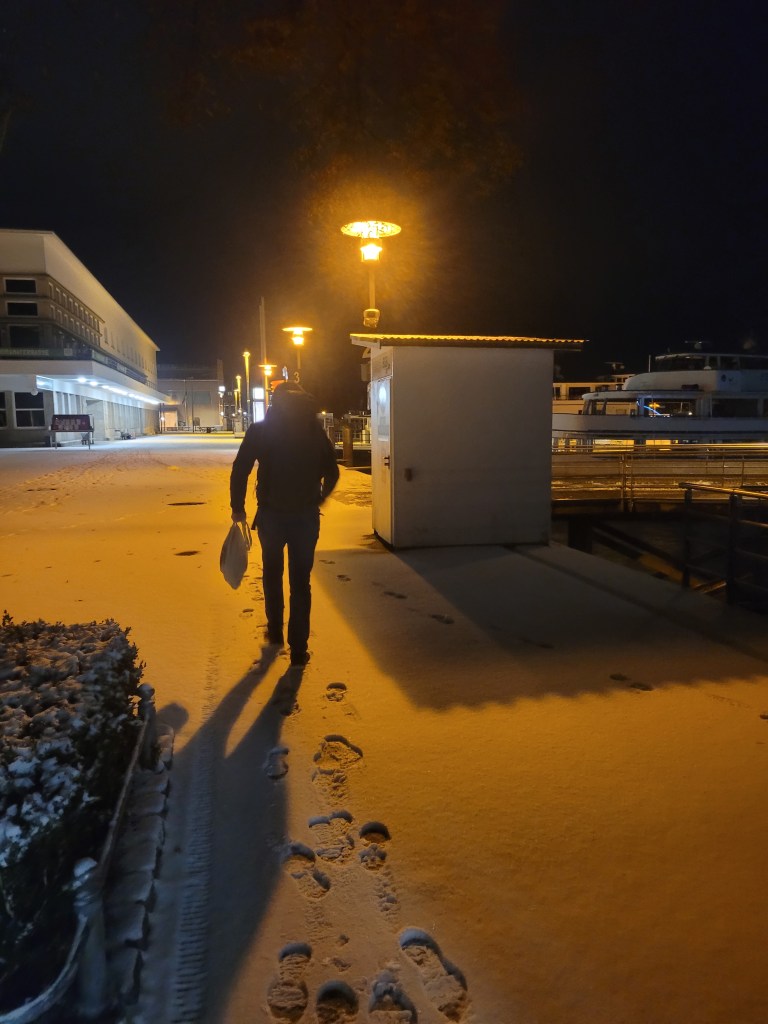 15 cm Pulverschnee lag überall, als wir morgens um 5 von Gerlinde abgeholt worden sind. 5.19 mit dem Zug nach FN an den Hafen und auch dort durch 5 cm Schnee zum Katamaran…
