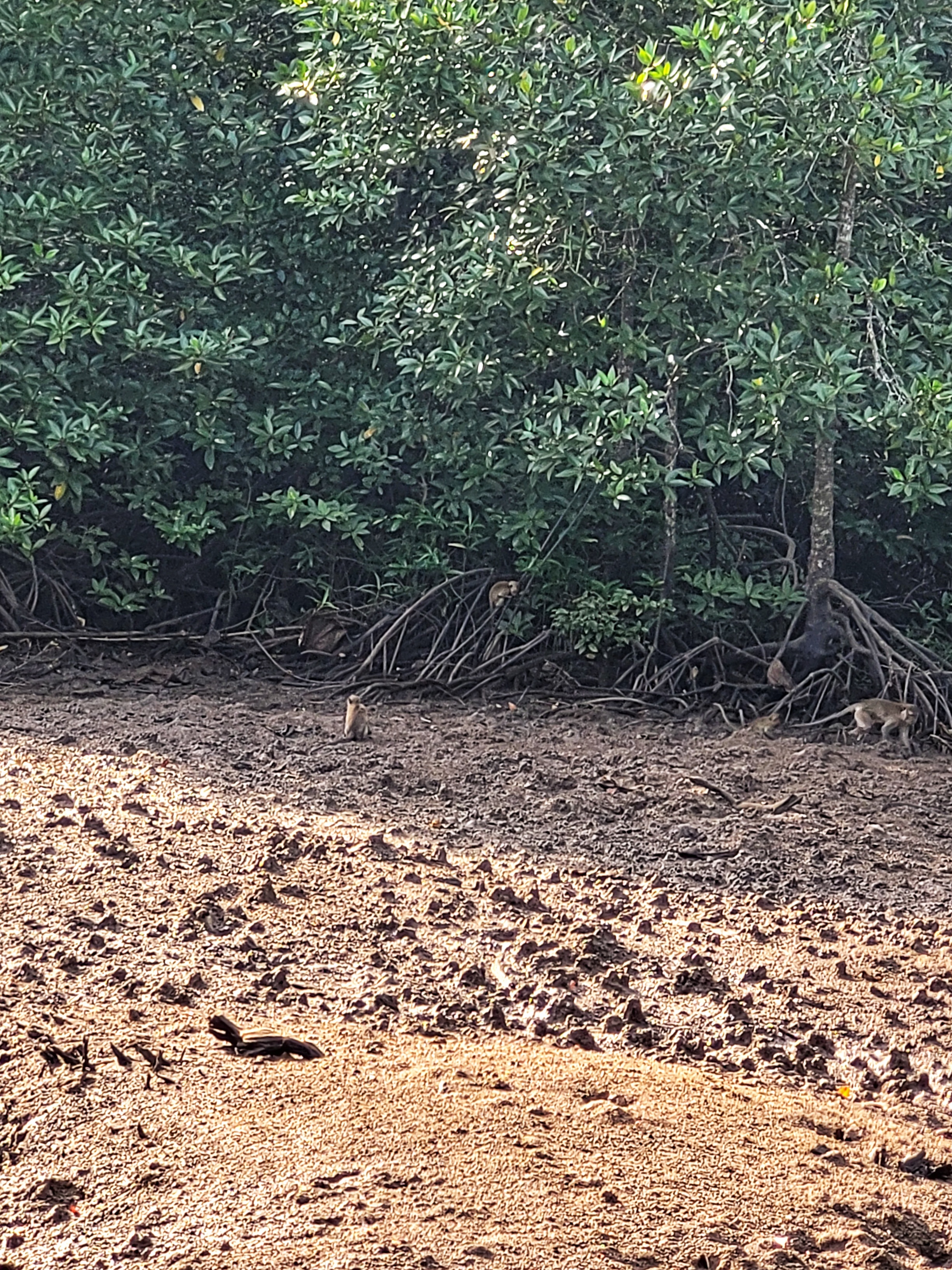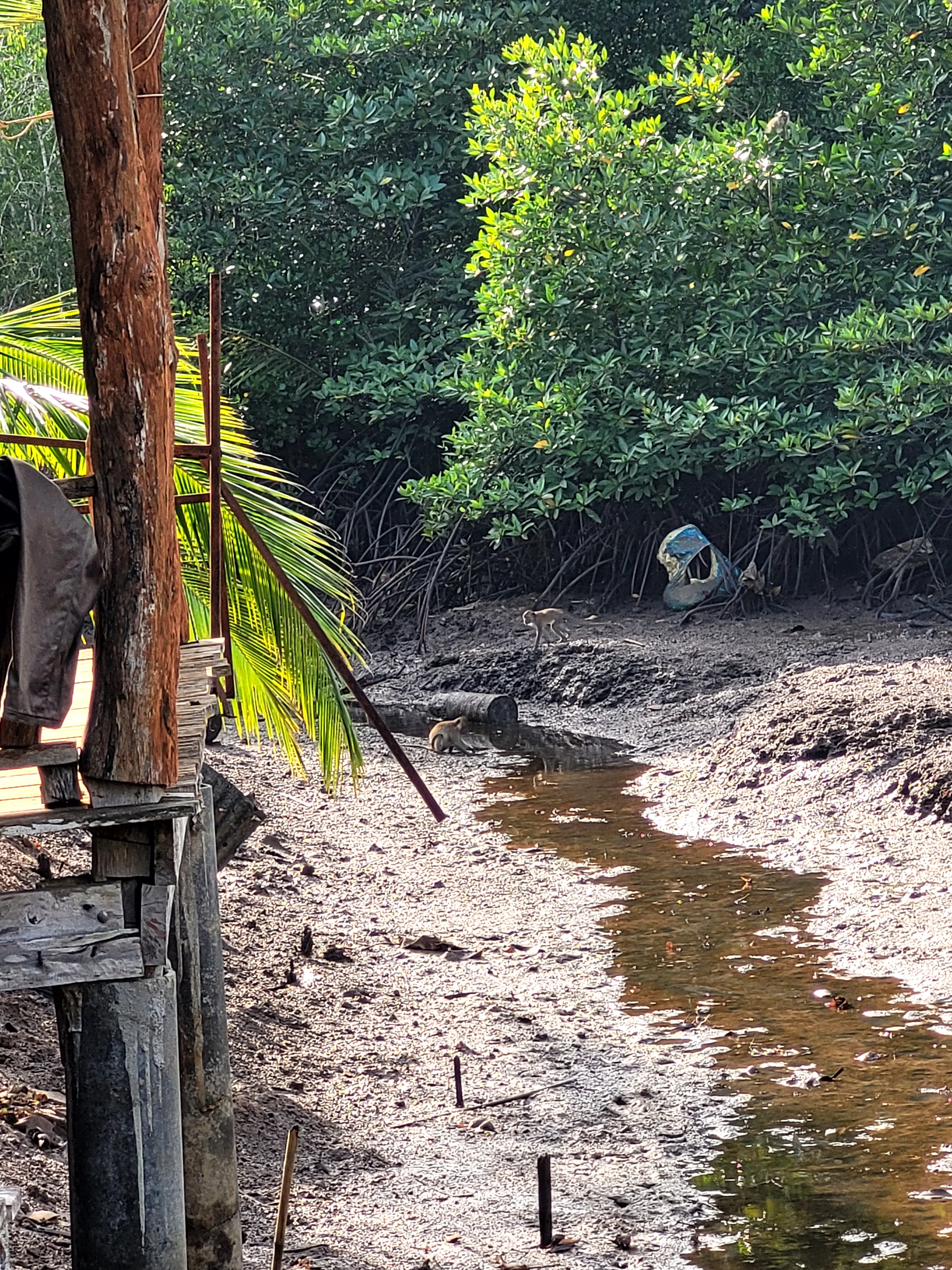 Katrin und ich hatten an unseren Bungalows eine Affenshow. Sie kamen bei Ebbe aus dem Wald und suchten Futter…