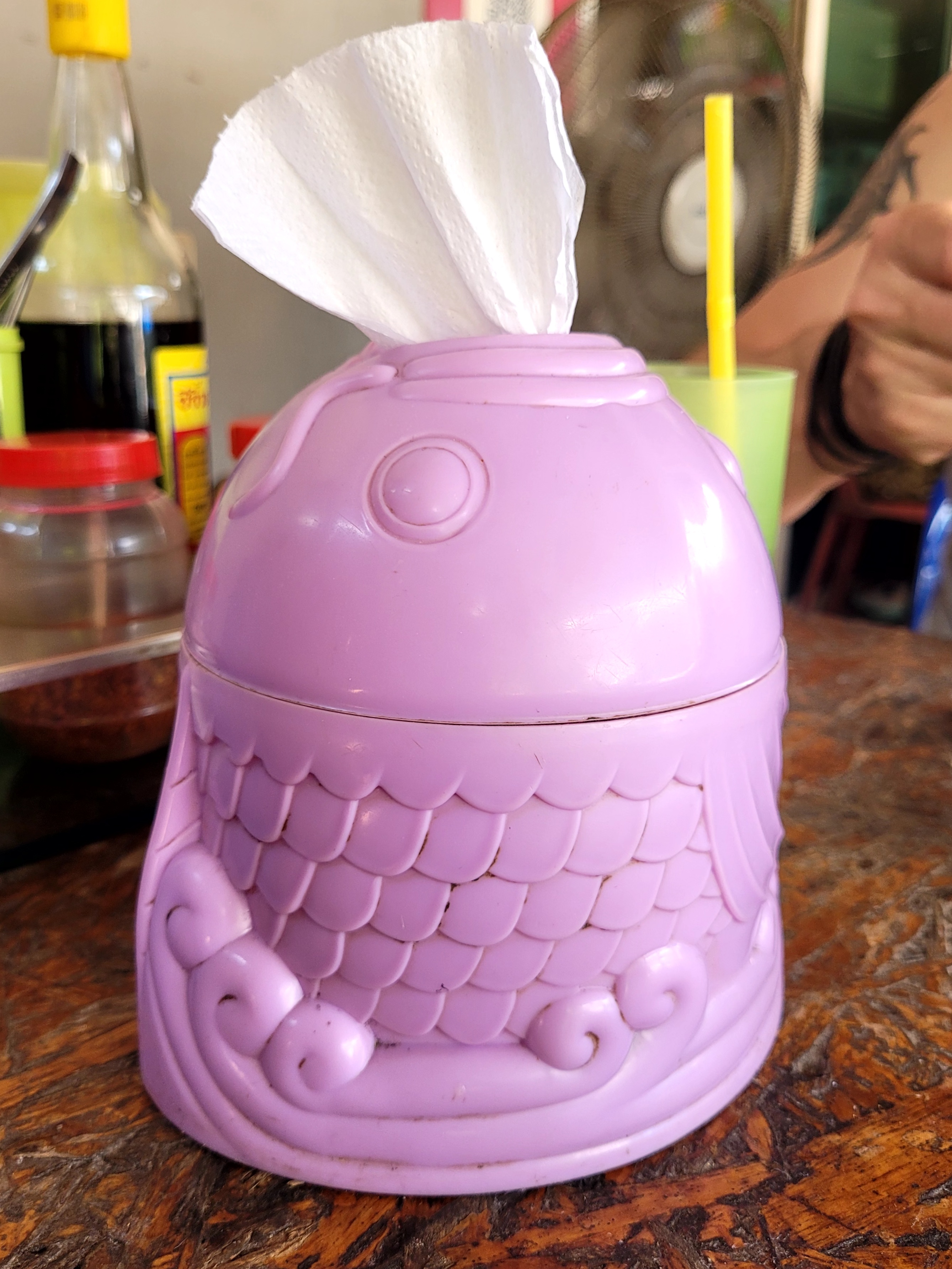 Servietten, wie auch Klopapier, sind in Thailand einlagig. Und tatsächlich gibt es ganz oft auch nur Klopapier als Servietten. Die meisten haben aber zumindest einen Spender dafür…