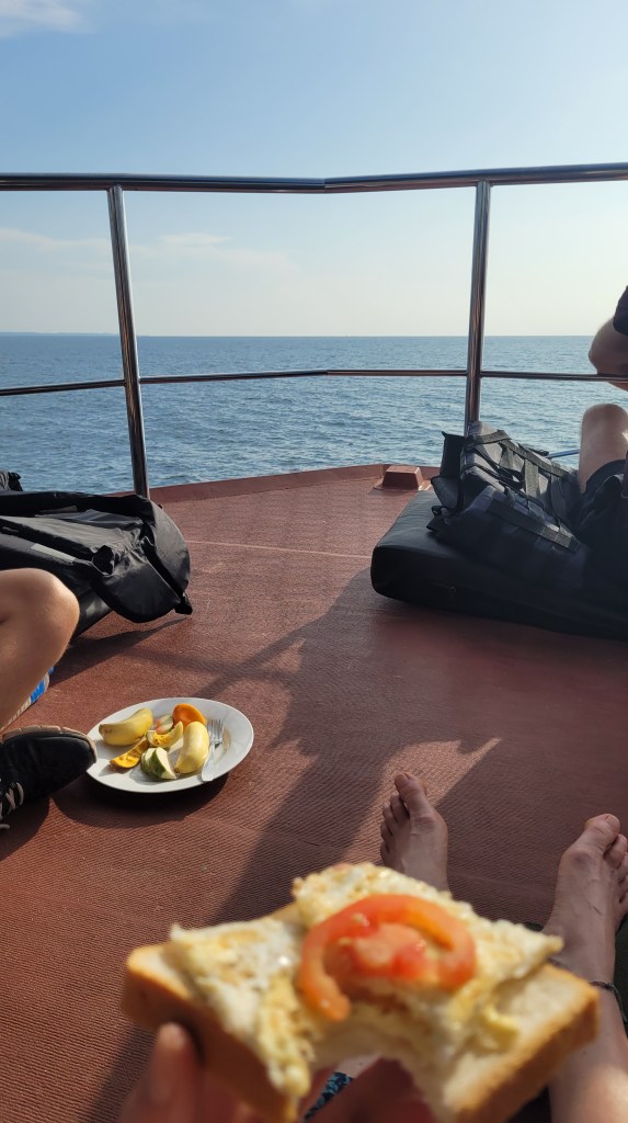 Wir hatten uns einen guten Platz ergattert und mit Früchteteller und Frühstück ging es eine Meile hinaus aufs offene Meer.