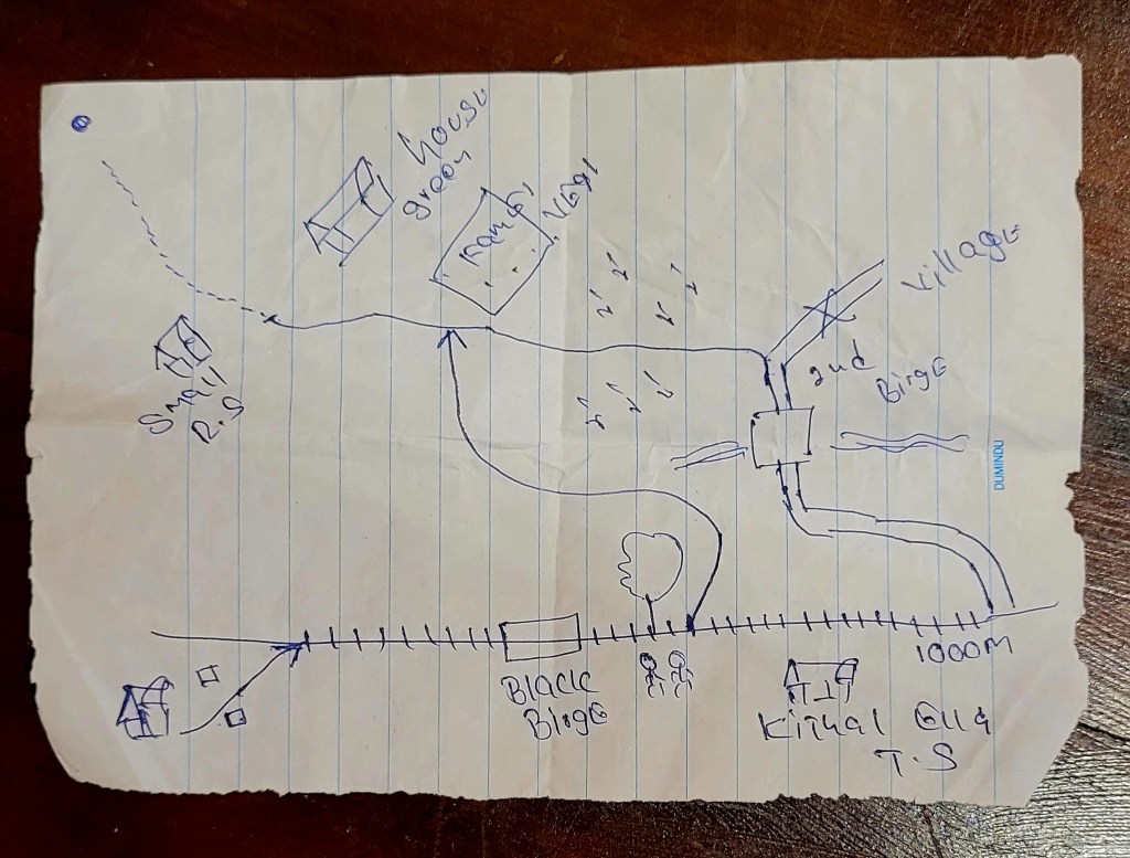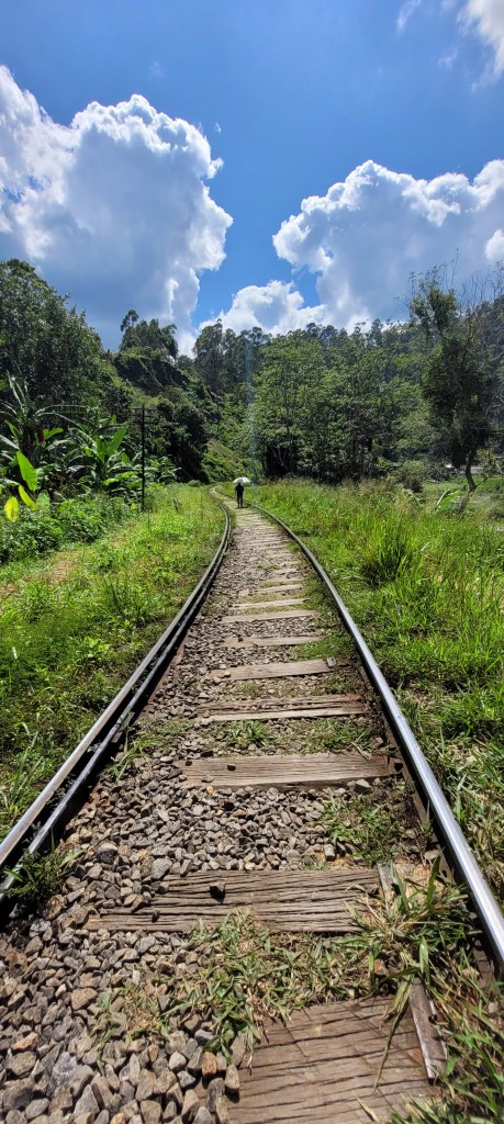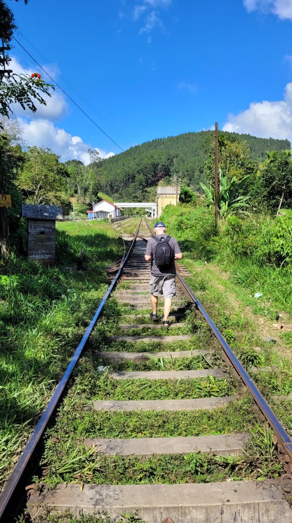 Ella’s Rock ist der höchste Gipfel in dieser Gegend und liegt auf 1350 m. In den Reiseführern steht dass man sich einen Guide nehmen soll. Aber Nimal, unser Gastgeber, schickt alle seine Gäste mit der selbst gemalten Karte auf den Weg. Also dann, erst mal wieder gute 2 km auf den Gleisen entlang.