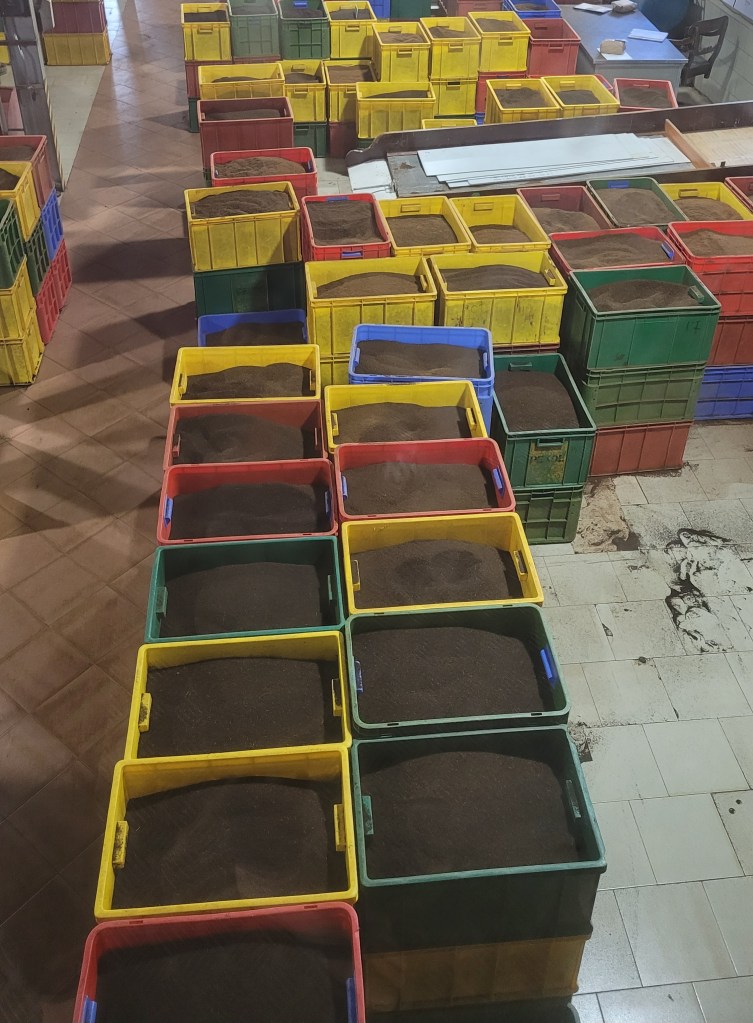 Zuerst werden 50-60% der Feuchtigkeit durch Ventilatoren entfernt. Je nach Jahreszeit und der dementsprechenden Luftfeuchtigkeit dauert das unterschiedlich lang (4-8 h). Zwischendurch wird von Hand gewendet.