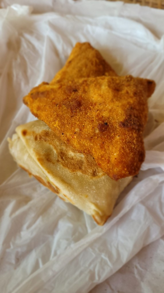Roti mit Kartoffeln gefüllt und einmal frittiert mit Ei gefüllt. Lecker aber spicy!