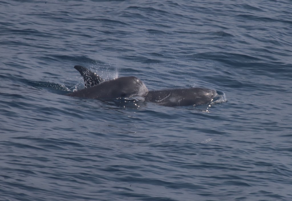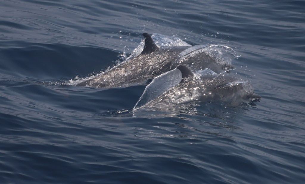 Und dann kamen die ersten Delfine. Risso Delfine, die nur auf der Durchreise vom arabischen ins bengalische Meer sind. Einer von ihnen hat vor unserem Boot einen Sprung vom feinsten hingelegt dass alle gejubelt haben.
