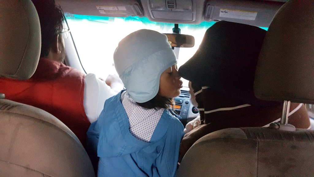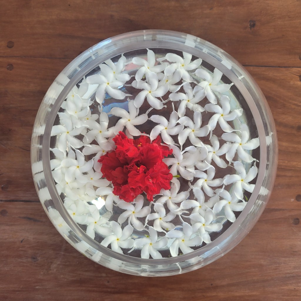 Dabei wird warmes Öl 25 Minuten lang über die Stirn gegossen. Man soll dabei mit der Atmung dem Strahl folgen. Ich glaube, es ging keine 10 Minuten und ich habe geschlafen. Die Haare sind voller Öl, das soll auch so sein, dass es noch nachwirken kann. 3 Tage hintereinander wird bei mir diese Anwendung durchgeführt. Man bekommt eine Haube auf, die hübsch mit einer Frangipaniblüte geschmückt wird 😍 Die Haube soll verhindern, dass das Öl nicht überall verteilt wird, und um den Kopf nicht auskühlen zu lassen.