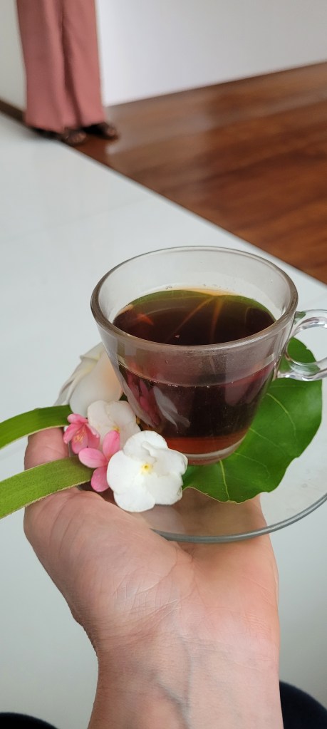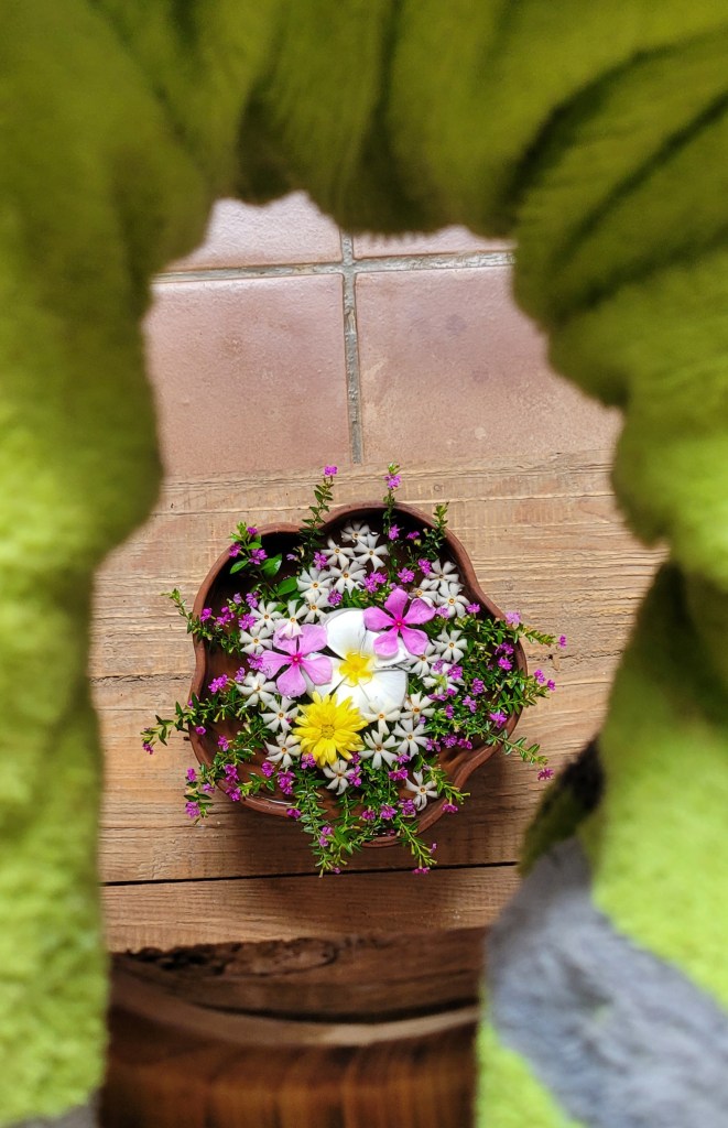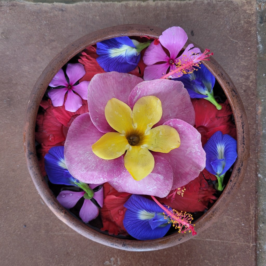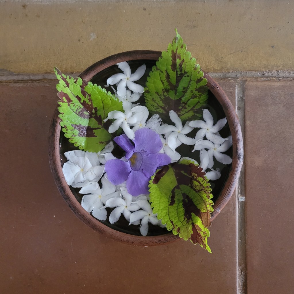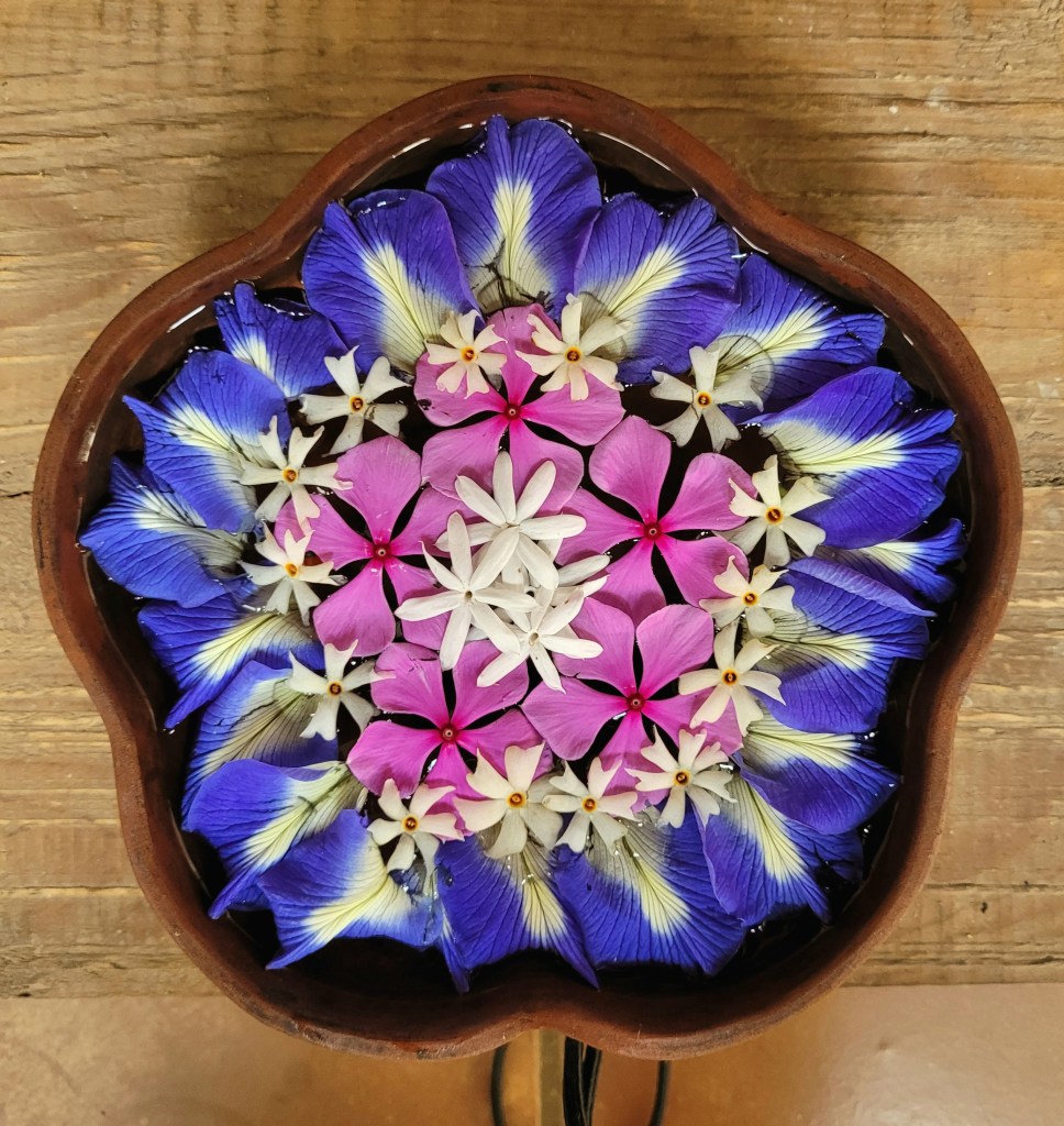 Es werden verschiedene Zusätze wie Limette, Bitterorange, Tamarinde, Milch, Essig, Honig und dazu gegossen und dann darf ich zwischen Jasmin und anderen Blüten weiter entspannen.