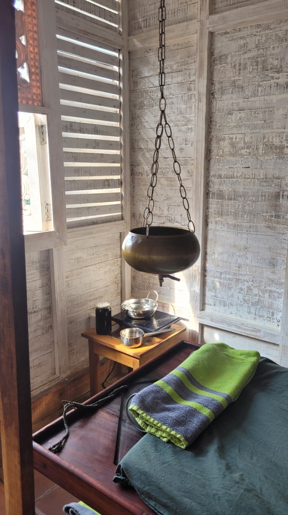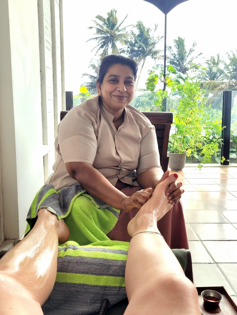 Sriyani geht mir gerade bis zur Brust, hat aber gleichzeitig so kräftige und sanfte Hände dass ich täglich unter diesen Händen dahin schmelze. Sie arbeitet seit 6 Jahren als zertifizierte Ayurveda Therapeutin und macht jede Anwendung bei mir.