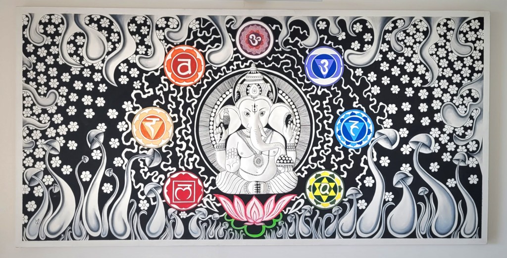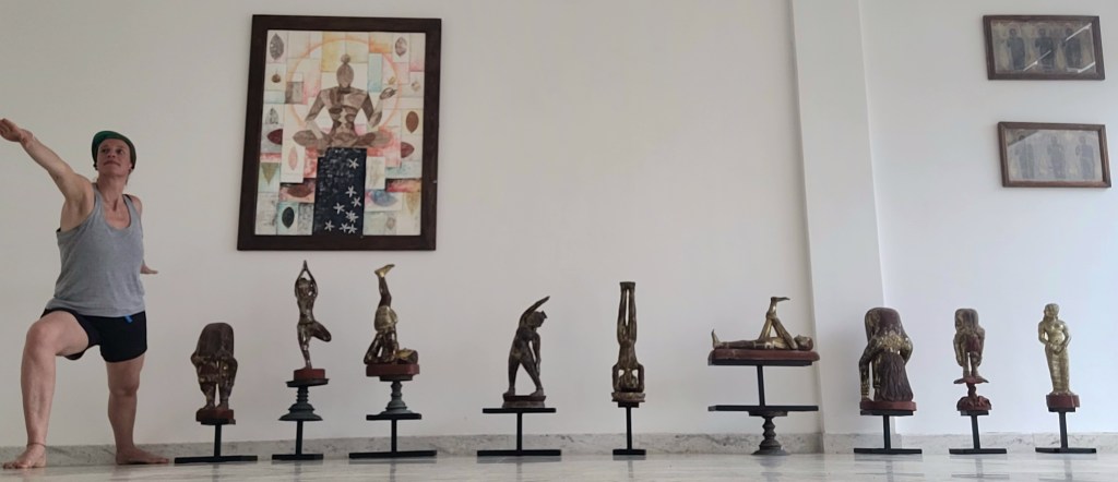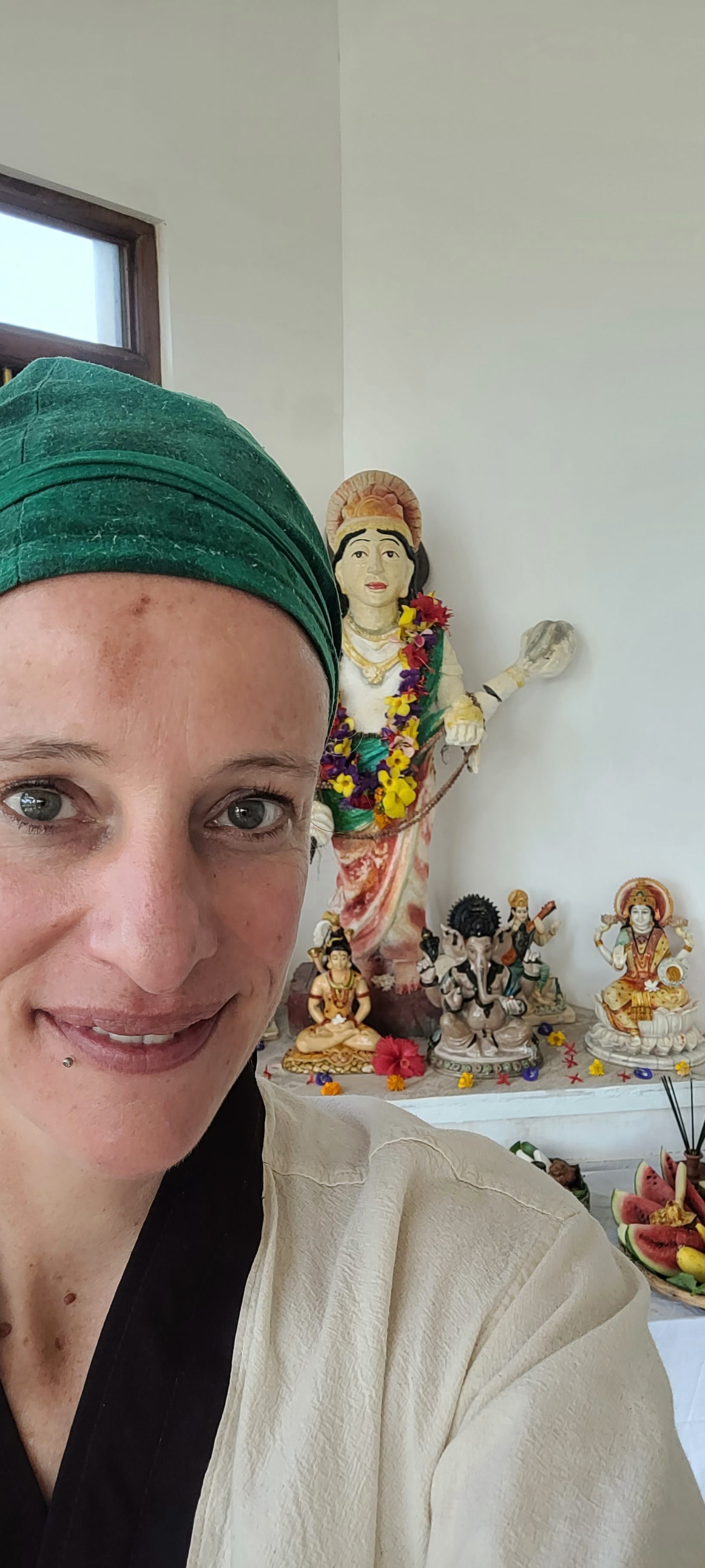 Hinter mir der Ayurveda Gott – ich konnte bei einer monatlichen hinduistischen Zeremonie zu Ehren diese Gottes dabei sein 🙌 (Funfakt: Diesem Gott werden Früchte, Wasser und Räucherstäbchen geopfert, letztes Jahr in Guatemala bei der Maya Zeremonie wurden Süßigkeiten, Alkohol und Tabak geopfert)