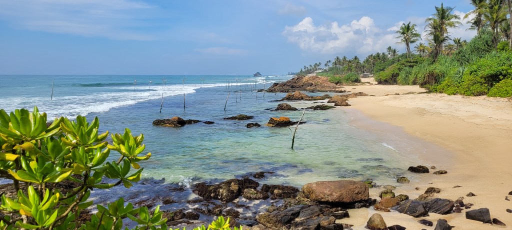 Ausserdem ist dieser Strand bei Surfern sehr beliebt und es hat sich eine kleine Aussteiger-Gemeinde gebildet. Und am Anfang des Strandes stehen die für Sri Lanka typischen Fischer Pfähle.
