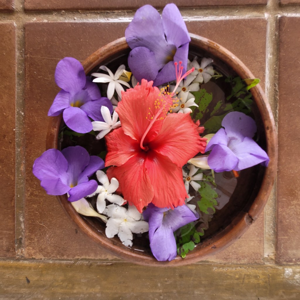 Blick auf meinen Behandlungsraum, wo Sriyani gerade frische Blumen richtet