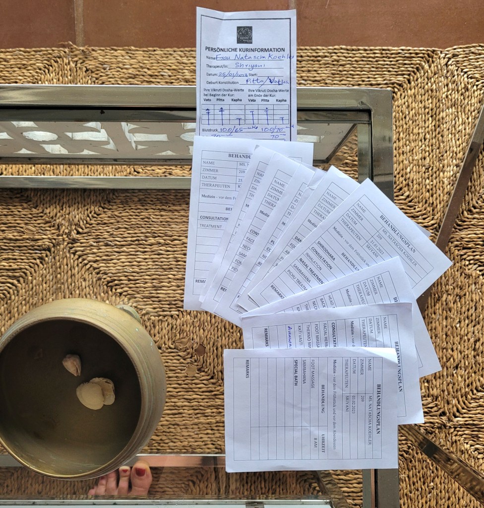Und die Ernährung wird je nach Dosha-Typ angepasst. Ich soll 3-4 Liter am Tag trinken. 2 verschiedene Kräutertees und bevorzugt warmes Wasser, was in 2 Thermoskannen auf dem Zimmer steht.