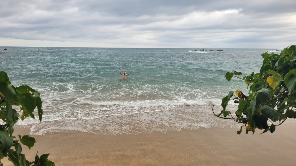 Es fing dann an zu regnen. Was hier deshalb nicht so schlimm ist, weil es einfach keinen Temperatursturz gibt. Und deshalb sind wir bei Regen dann noch ins Meer.