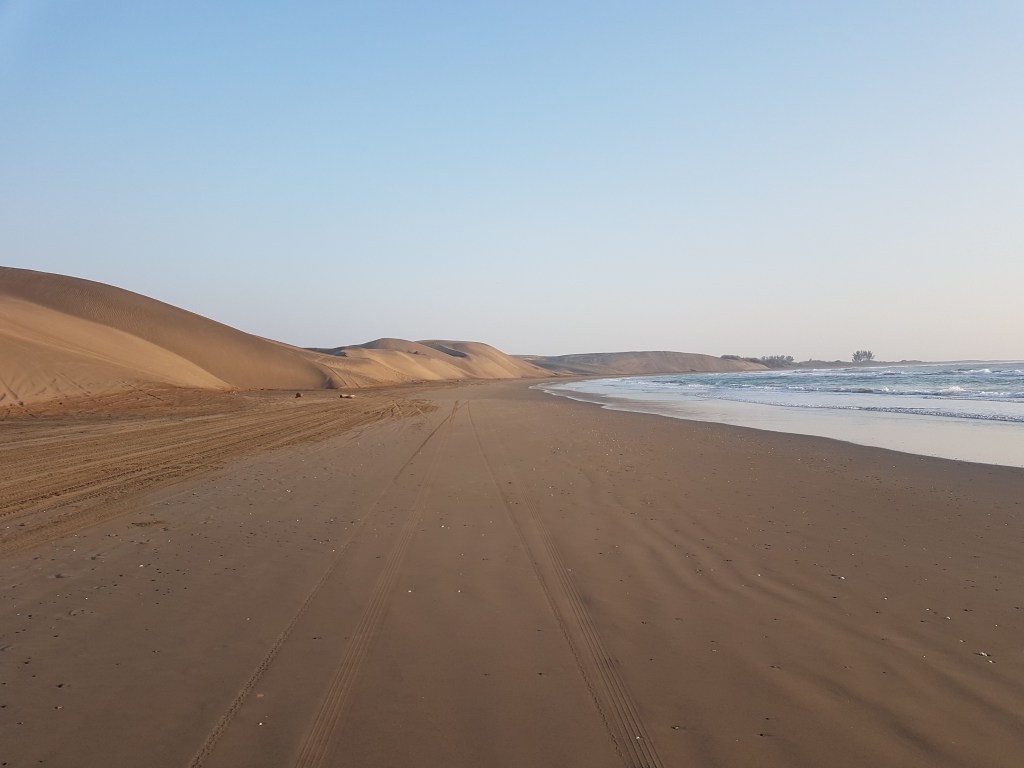 Und weiter ging die Fahrt. Wegen des stürmischen Wetters war die Straße einmal nur einspurig zu befahren, da sie mit Baggern und Schaufeln die Sandverwehungen beseitigen mussten.
