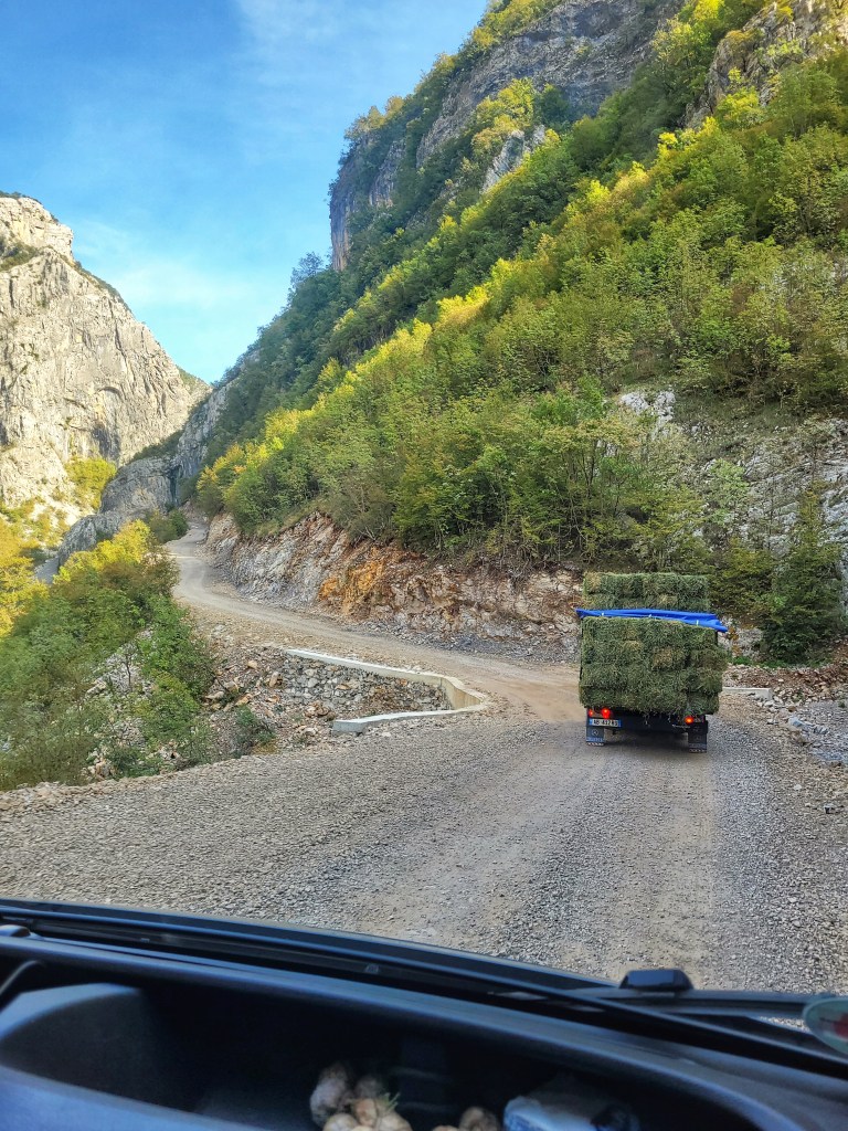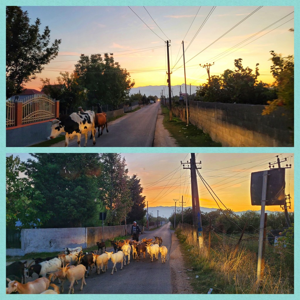 Wir unterhielten uns noch viel über die Tiere, denn auch Schafe zogen an uns vorbei. Was für ein Leben, könnte man meinen. Auch die Hühner laufen in Albanien frei umher, auf den Straßen stehen gemütlich vor sich hin malmende Kühe. Abends sieht man, meist die Frauen, die ihre Ziegen, Schafe, Kühe wieder einsammeln und nach Hause bringen. Aber dann wird auch mal mit Ruten draufgehauen. Ein Esel hat uns beiden das Herz gebrochen. Er war angeleint, starrte vor sich hin. Und, seine Vorderläufe waren zusammen gebunden. Auch Pferde standen einzeln angebunden an Straßenrändern, standen da halt. Wir diskutierten, ob die Straßenhunde nicht vielleicht doch besser dran waren… Die konnten sich wenigsten frei bewegen, den Menschen aus dem Weg gehen. Katzen können sich eh selbst versorgen. Die angebundenen Nutztiere haben wahrscheinlich weniger Hunger, aber von artgerechter Haltung ist das was wir gesehen haben, weit entfernt. Arme, schutzlose Tiere😪