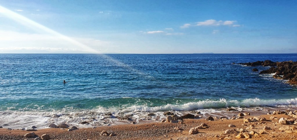So wie in Himara schon viel mehr Womos unterwegs waren, kamen den ganzen Tag Touristen vorbeigewandert, hielten sich am Strand auf. Und brachten ihre ganzen Gerüche mit. Wenn man sich so viel in der freien Natur aufhält, ist es ein – nicht immer schönes Sinneserlebnis – wenn plötzlich wieder so viele Menschen um einen herum sind. Selbst im Fordinand, mit geöffneter Tür, roch ich die verschiedenen Parfums. Das eine Pärchen roch auch noch, als beide im Wasser waren. Das Angenehmste waren die, die nur nach frischer Wäsche rochen.